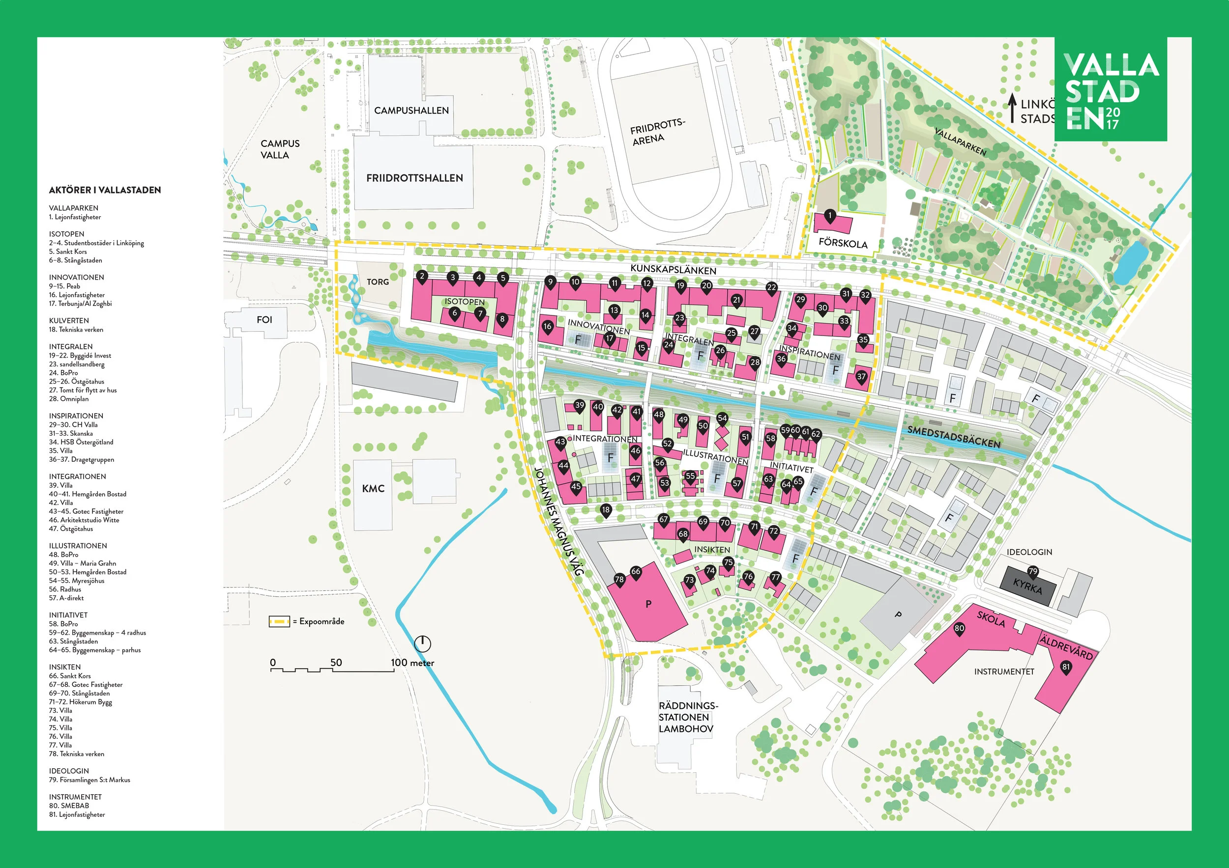 Planering: Linköping kommun, Linköpingsexpo. Team: Okidoki Arkitekter; arkitekter SAR/MSA Rickard Stark (områdesarkitekt), Martin Nordahl, Christina Silfverhielm. Samhällsbyggnadsnämnden: landskapsarkitekt MSA Fanny Wahlqvist, Magnus Liljedal, arkitekt MSA Magnus Hultegård, planeringsarkitekt MSA Erik Adolfsson, Lisa Zetterdahl, arkitekt SAR/MSA Mathias Hult, landskapsarkitekt MSA Liselott Johansson, Henrik Lamberthz (infrastruktur).